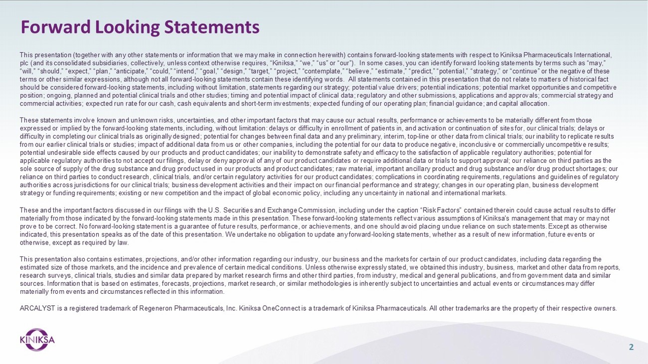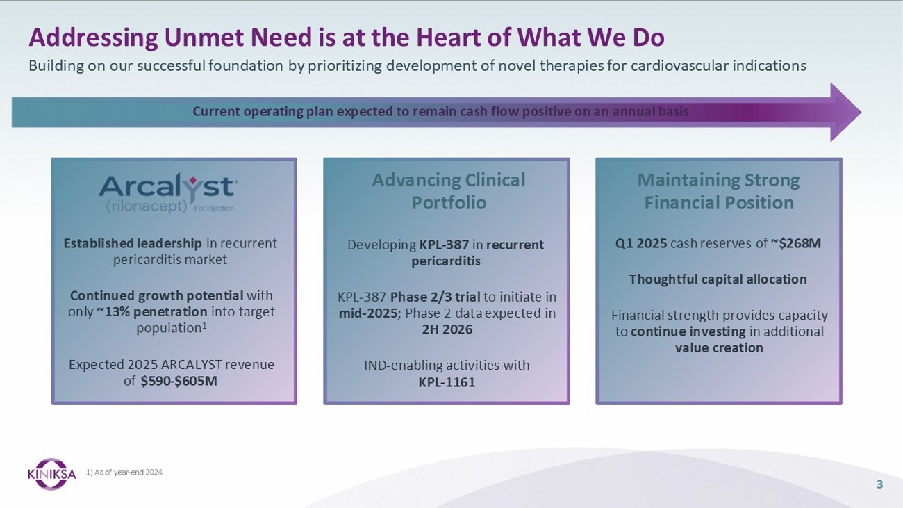 2 This presentation (together with any other statements or information that we may make in connection herewith) contains forward - looking statements with respect to Kiniksa Pharmaceuticals International, plc (and its consolidated subsidiaries, collectively, unless context otherwise requires, “Kiniksa,” “we,” “us” or “our”). In some cases, you can identify forward looking statements by terms such as “may,” “will,” “should,” “expect,” “plan,” “anticipate,” “could,” “intend,” “goal,” “design,” “target,” “project,” “contemplate,” “believe,” “estimate,” “predict,” “potential,” “strategy,” or “continue” or the negative of these terms or other similar expressions, although not all forward - looking statements contain these identifying words. All statements contained in this presentation that do not relate to matters of historical fact should be considered forward - looking statements, including without limitation, statements regarding our strategy; potential value drivers; potential indications; potential market opportunities and competitive position; ongoing, planned and potential clinical trials and other studies; timing and potential impact of clinical data; regulatory and other submissions, applications and approvals; commercial strategy and commercial activities; expected run rate for our cash, cash equivalents and short - term investments; expected funding of our operating plan; financial guidance; and capital allocation. These statements involve known and unknown risks, uncertainties, and other important factors that may cause our actual results, performance or achievements to be materially different from those expressed or implied by the forward - looking statements, including, without limitation: delays or difficulty in enrollment of patients in, and activation or continuation of sites for, our clinical trials; delays or difficulty in completing our clinical trials as originally designed; potential for changes between final data and any preliminary, interim, top - line or other data from clinical trials; our inability to replicate results from our earlier clinical trials or studies; impact of additional data from us or other companies, including the potential for our data to produce negative, inconclusive or commercially uncompetitive results; potential undesirable side effects caused by our products and product candidates; our inability to demonstrate safety and efficacy to the satisfaction of applicable regulatory authorities; potential for applicable regulatory authorities to not accept our filings, delay or deny approval of any of our product candidates or require additional data or trials to support approval; our reliance on third parties as the sole source of supply of the drug substance and drug product used in our products and product candidates; raw material, important ancillary product and drug substance and/or drug product shortages; our reliance on third parties to conduct research, clinical trials, and/or certain regulatory activities for our product candidates; complications in coordinating requirements, regulations and guidelines of regulatory authorities across jurisdictions for our clinical trials; business development activities and their impact on our financial performance and strategy; changes in our operating plan, business development strategy or funding requirements; existing or new competition and the impact of global economic policy, including any uncertainty in national and international markets. These and the important factors discussed in our filings with the U.S. Securities and Exchange Commission, including under the caption “Risk Factors” contained therein could cause actual results to differ materially from those indicated by the forward - looking statements made in this presentation. These forward - looking statements reflect various assumptions of Kiniksa's management that may or may not prove to be correct. No forward - looking statement is a guarantee of future results, performance, or achievements, and one should avoid placing undue reliance on such statements. Except as otherwise indicated, this presentation speaks as of the date of this presentation. We undertake no obligation to update any forward - looking statements, whether as a result of new information, future events or otherwise, except as required by law. This presentation also contains estimates, projections, and/or other information regarding our industry, our business and the markets for certain of our product candidates, including data regarding the estimated size of those markets, and the incidence and prevalence of certain medical conditions. Unless otherwise expressly stated, we obtained this industry, business, market and other data from reports, research surveys, clinical trials, studies and similar data prepared by market research firms and other third parties, from industry, medical and general publications, and from government data and similar sources. Information that is based on estimates, forecasts, projections, market research, or similar methodologies is inherently subject to uncertainties and actual events or circumstances may differ materially from events and circumstances reflected in this information. ARCALYST is a registered trademark of Regeneron Pharmaceuticals, Inc. Kiniksa OneConnect is a trademark of Kiniksa Pharmaceuticals. All other trademarks are the property of their respective owners. Forward Looking Statements