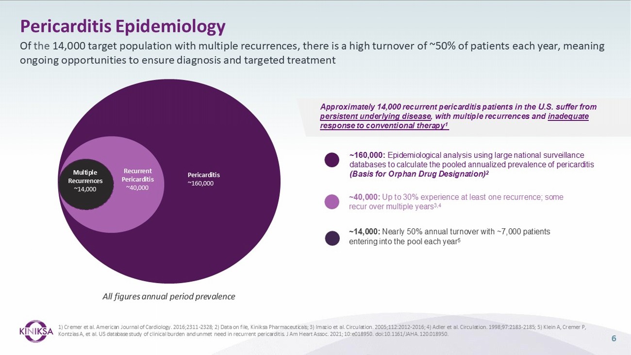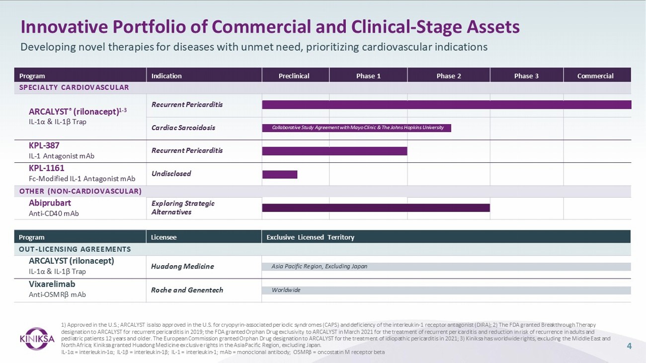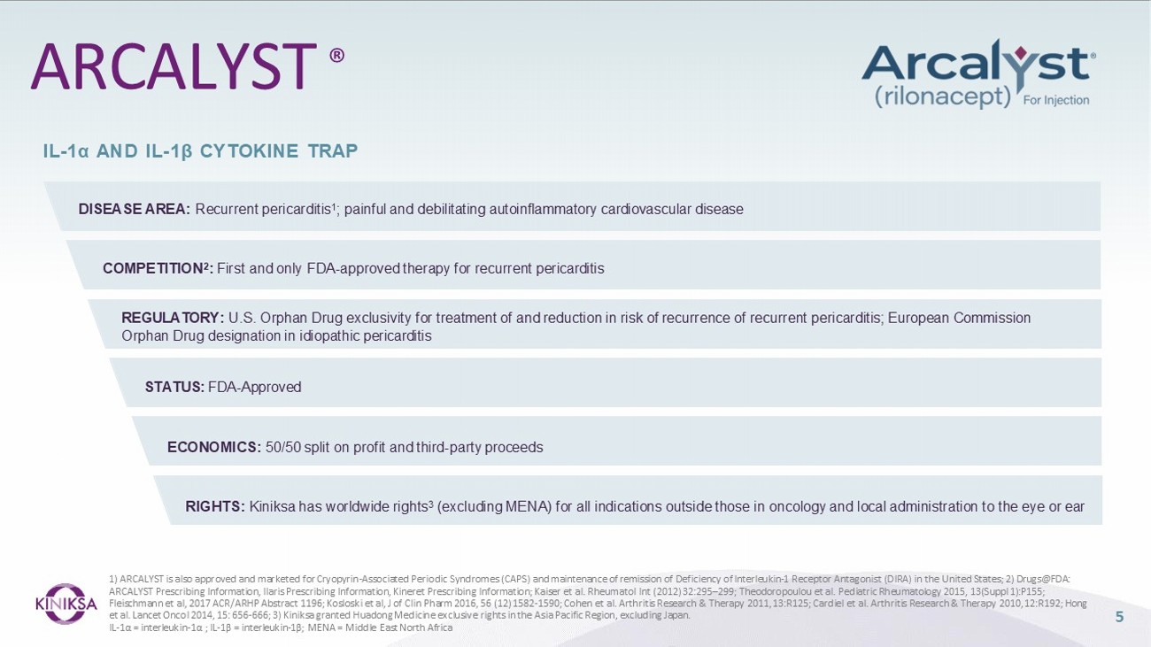 4 1) Approved in the U.S.; ARCALYST is also approved in the U.S. for cryopyrin - associated periodic syndromes (CAPS) and deficiency of the interleukin - 1 receptor antagonist (DIRA); 2) The FDA granted Breakthrough Therapy designation to ARCALYST for recurrent pericarditis in 2019; the FDA granted Orphan Drug exclusivity to ARCALYST in March 2021 for the treatment of recurrent pericarditis and reduction in risk of recurrence in adults and pediatric patients 12 years and older. The European Commission granted Orphan Drug designation to ARCALYST for the treatment of idiopathic pericarditis in 2021; 3) Kiniksa has worldwide rights, excluding the Middle East and North Africa; Kiniksa granted Huadong Medicine exclusive rights in the Asia Pacific Region, excluding Japan. IL - 1α = interleukin - 1α; IL - 1β = interleukin - 1β; IL - 1 = interleukin - 1; mAb = monoclonal antibody; OSMRβ = oncostatin M receptor beta Innovative Portfolio of Commercial and Clinical - Stage Assets Developing novel therapies for diseases with unmet need, prioritizing cardiovascular indications Commercial Phase 3 Phase 2 Phase 1 Preclinical Indication Program SPECIALTY CARDIOVASCULAR Recurrent Pericarditis ARCALYST ® (rilonacept) 1 - 3 IL - 1α & IL - 1β Trap Cardiac Sarcoidosis Collaborative Study Agreement with Mayo Clinic & The Johns Hopkins University Recurrent Pericarditis KPL - 387 IL - 1 Antagonist mAb Undisclosed KPL - 1161 Fc - Modified IL - 1 Antagonist mAb OTHER (NON - CARDIOVASCULAR) Exploring Strategic Alternatives Abiprubart Anti - CD40 mAb Exclusive Licensed Territory Licensee Program OUT - LICENSING AGREEMENTS Huadong Medicine ARCALYST (rilonacept) IL - 1α & IL - 1β Trap Asia Pacific Region, Excluding Japan Roche and Genentech Vixarelimab Anti - OSMRβ mAb Worldwide