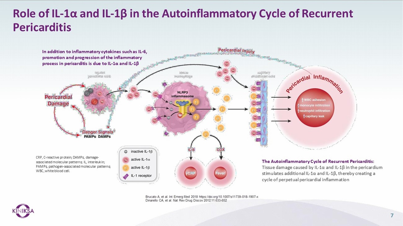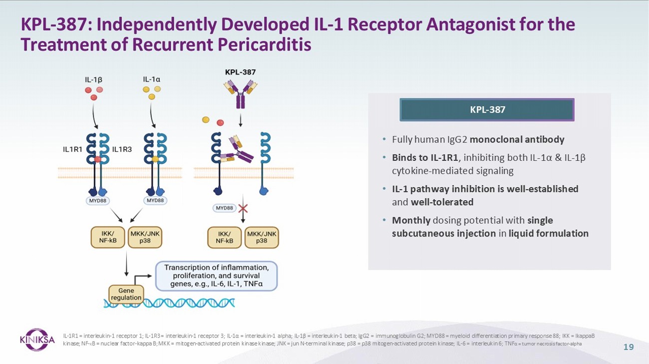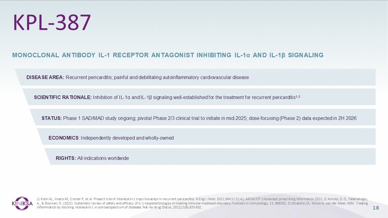 DISEASE AREA: Recurrent pericarditis; painful and debilitating autoinflammatory cardiovascular disease SCIENTIFIC RATIONALE: Inhibition of IL - 1α and IL - 1β signaling well - established for the treatment for recurrent pericarditis 1 - 3 STATUS: Phase 1 SAD/MAD study ongoing; pivotal Phase 2/3 clinical trial to initiate in mid - 2025; dose - focusing (Phase 2) data expected in 2H 2026 ECONOMICS : Independently developed and wholly - owned RIGHTS: All indications worldwide KPL - 387 18 MONOCLONAL ANTIBODY IL - 1 RECEPTOR ANTAGONIST INHIBITING IL - 1α AND IL - 1β SIGNALING 1 ) Klein AL, Imazio M, Cremer P, et al . Phase 3 trial of interleukin - 1 trap rilonacept in recurrent pericarditis . N Engl J Med . 2021 ; 384 ( 1 ) : 31 - 41 ; ARCALYST (rilonacept) prescribing information 2021 ; 2 ) Arnold, D . D . , Yalamanoglu, A . , & Boyman, O . ( 2022 ) . Systematic review of safety and efficacy of IL - 1 - targeted biologics in treating immune - mediated disorders . Frontiers in immunology, 13 , 888392 ; 3 ) Dinarello CA, Simon A, van der Meer JWM . Treating inflammation by blocking interleukin - 1 in a broad spectrum of diseases . Nat rev drug Discov, 2012 ; 11 ( 8 ) ; 633 - 652 .