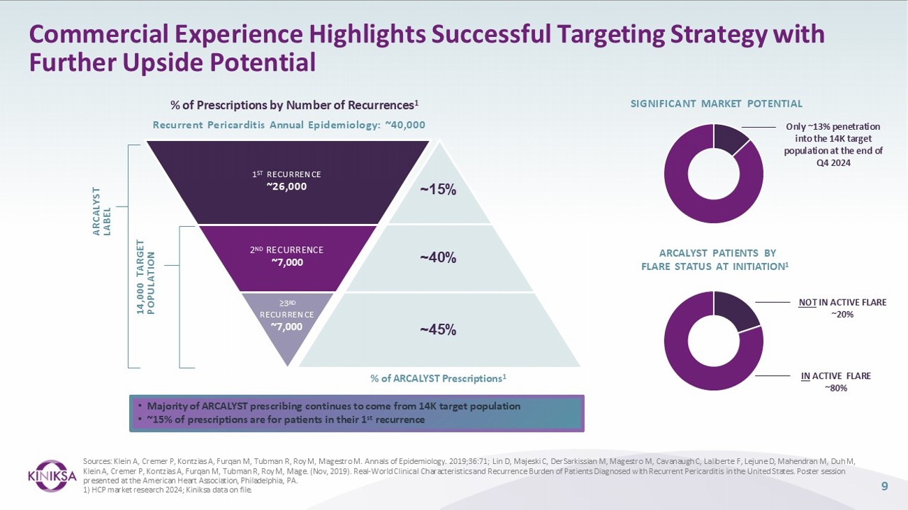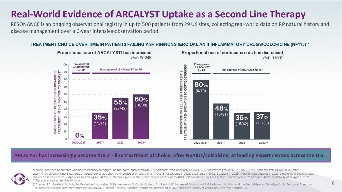 8 ARCALYST has increasingly become the 2 nd line treatment of choice, after NSAIDs/colchicine, at leading expert centers across the U.S. Proportional use of corticosteroids has decreased ; P =0.0169 † Proportional use of ARCALYST ‡ has increased ; P =0.0024 TREATMENT CHOICE OVER TIME IN PATIENTS FAILING ASPIRIN/NONSTEROIDAL ANTI - INFLAMMATORY DRUGS/COLCHICINE (N=113) 1 * *Failing is defined as patients who had to intensify to higher - line therapies, such as csDMARDs, corticosteroids, anakinra, or ARCALYST; † Reference group is 2020 - 2021; ‡ Of 52 patients starting ARCALYST after aspirin/NSAIDs/colchicine, 5 patients utilized steroids as a short - term bridge prior to starting ARCALYST (2 patients in 2021, 2 patients in 2022, 1 patient in 2023); 4 patients (2 patients in 2021, 2 patients in 2023) utilized anakinra as a short - term bridge prior to starting ARCALYST; Α Reference group is 2021; II Partial year 2021 prior to ARCALYST availability on April 1, 2021; ¶ Partial year 2021 after ARCALYST availability after April 1, 2021. **Data censored at last check - in visit. 1) Cremer, PC, Garshick, M, Luis, SA, Raisinghani, A, Weber, B, Parmeswaran, V, Curtis, A, Klein, AL, Paolini, JF. Increased Adoption of IL - 1 Pathway Inhibition and the Steroid - Sparing Paradigm Shift: Temporal Trends in Recurrent Pericarditis Treatment from the RESONANCE Patient Registry. Adapted from poster presented at 2024 European Society of Cardiology Congress. London, UK. Real - World Evidence of ARCALYST Uptake as a Second Line Therapy RESONANCE is an ongoing observational registry in up to 500 patients from 29 US sites, collecting real - world data on RP natural history and disease management over a 6 - year intensive - observation period