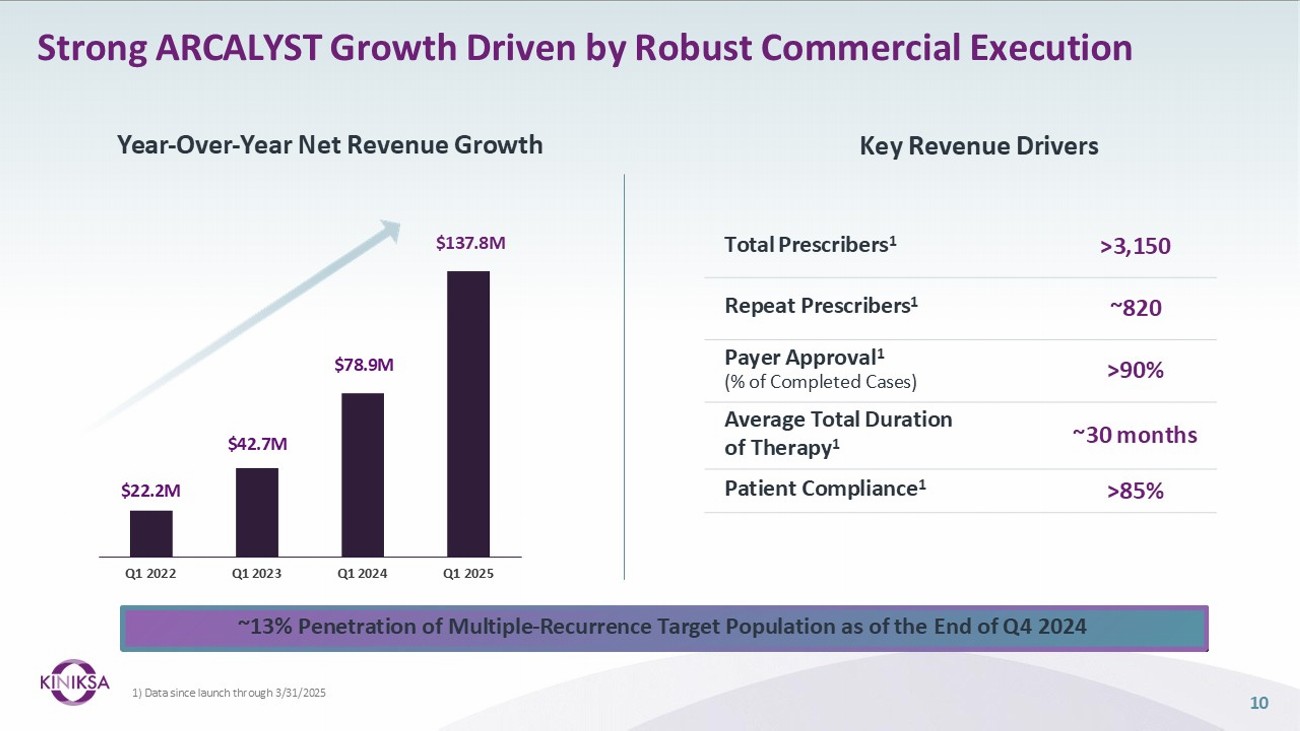 Commercial Experience Highlights Successful Targeting Strategy with Further Upside Potential ARCALYST PATIENTS BY FLARE STATUS AT INITIATION 1 IN ACTIVE FLARE ~80% NOT IN ACTIVE FLARE ~20% Only ~13% penetration into the 14K target population at the end of Q4 2024 SIGNIFICANT MARKET POTENTIAL 9 % of ARCALYST Prescriptions 1 1 ST RECURRENCE ~26,000 2 ND RECURRENCE ~7,000 ≥3 RD RECURRENCE ~7,000 ARCALYST LABEL 14 , 000 TARGET POPULATION ~15% ~40% ~45% % of Prescriptions by Number of Recurrences 1 Recurrent Pericarditis Annual Epidemiology: ~40,000 • Majority of ARCALYST prescribing continues to come from 14K target population • ~15% of prescriptions are for patients in their 1 st recurrence Sources: Klein A, Cremer P, Kontzias A, Furqan M, Tubman R, Roy M, Magestro M. Annals of Epidemiology. 2019;36:71; Lin D, Majeski C, DerSarkissian M, Magestro M, Cavanaugh C, Laliberte F, Lejune D, Mahendran M, Duh M, Klein A, Cremer P, Kontzias A, Furqan M, Tubman R, Roy M, Mage. (Nov, 2019). Real - World Clinical Characteristics and Recurrence Burden of Patients Diagnosed with Recurrent Pericarditis in the United States. Poster session presented at the American Heart Association, Philadelphia, PA. 1) HCP market research 2024; Kiniksa data on file.