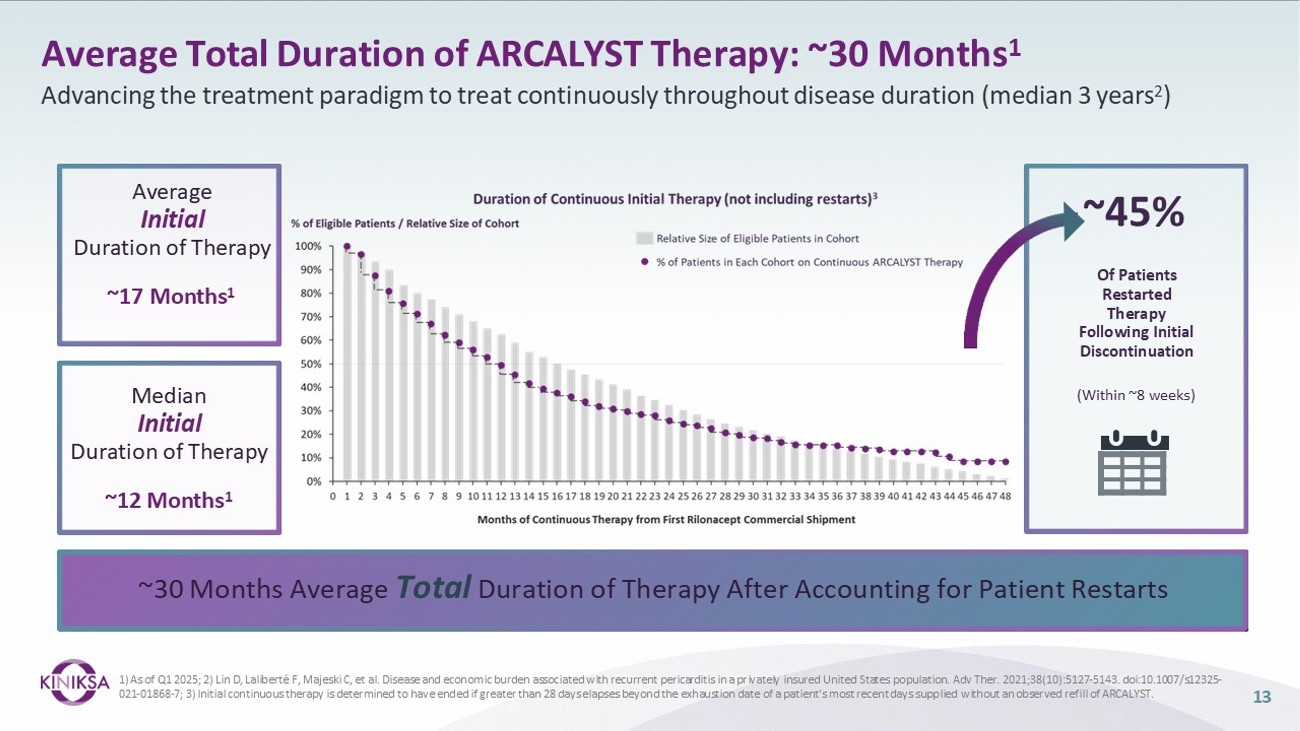 12 Time ARCALYST Patient Flow New to Brand Patients Patient Stops Patient Restarts Active Patients Strong steady growth: >3,150 unique prescribers; ~26% of which are repeat prescribers Increases over time as base of active ARCALYST patients grows with Initial Starts and Restarts Increases over time as patient stops increase ; currently ~ 45 % after ~ 8 weeks Increases over time driven by new - to - brand and restart growth; as of Q4 2024, ~13% of 14K multiple recurrence target patient population Illustrative Patient Flow New Starts Patient Restarts Patient Stops Launch (2021) Growth in Total Patients on ARCALYST Therapy Acceleration in new - to - brand and restart patients offset higher patient stops over time