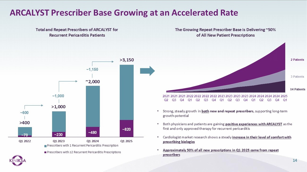 13 ~45% Of Patients Restarted Therapy Following Initial Discontinuation (Within ~8 weeks) Average Initial Duration of Therapy ~17 Months 1 Median Initial Duration of Therapy ~12 Months 1 ~30 Months Average Total Duration of Therapy After Accounting for Patient Restarts Average Total Duration of ARCALYST Therapy: ~30 Months 1 Advancing the treatment paradigm to treat continuously throughout disease duration (median 3 years 2 ) 1) As of Q1 2025; 2) Lin D, Laliberté F, Majeski C, et al. Disease and economic burden associated with recurrent pericarditis in a privately insured United States population. Adv Ther. 2021;38(10):5127 - 5143. doi:10.1007/s12325 - 021 - 01868 - 7; 3) Initial continuous therapy is determined to have ended if greater than 28 days elapses beyond the exhaustion date of a patient's most recent days supplied without an observed refill of ARCALYST.
