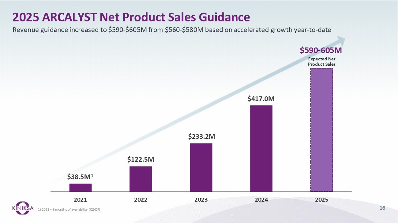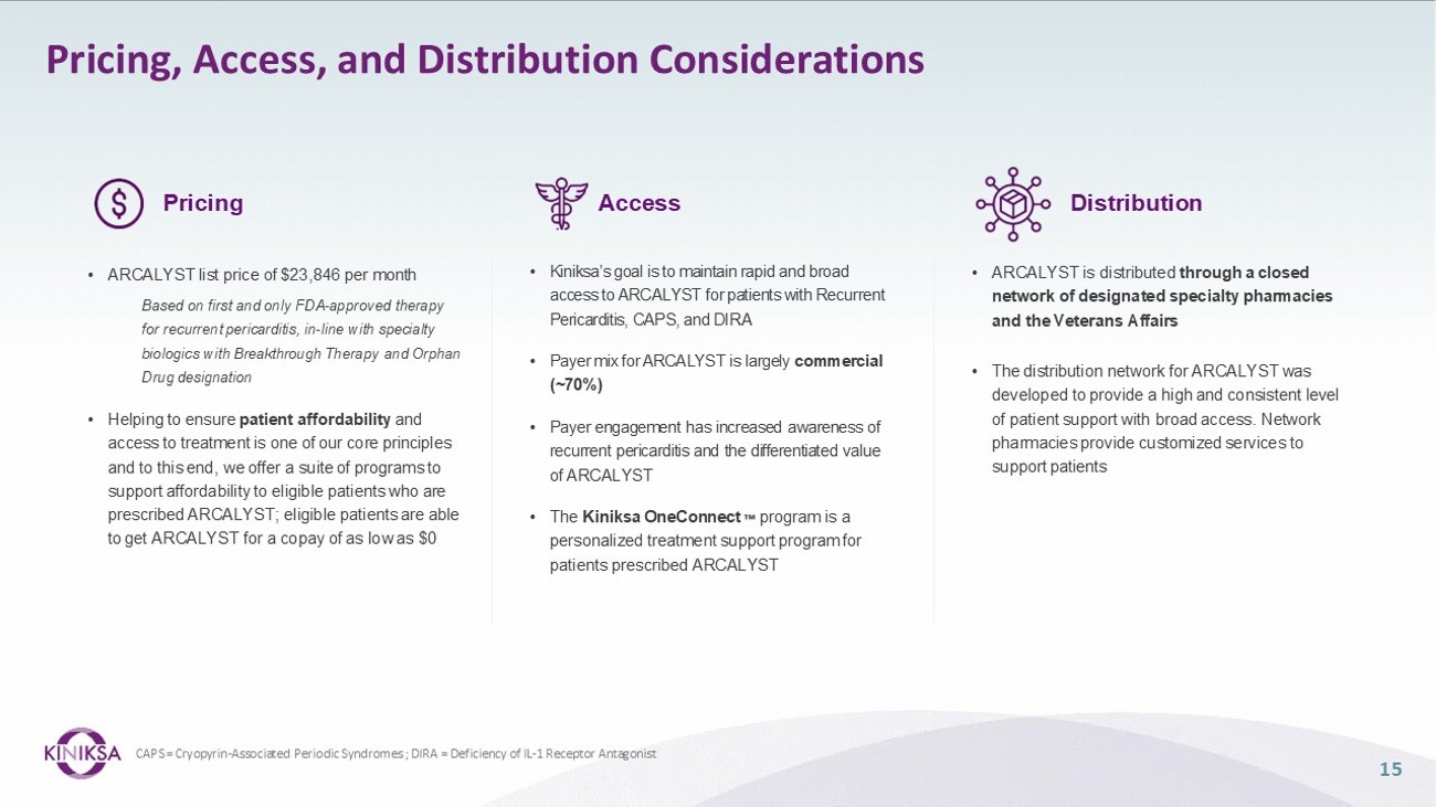 • ARCALYST list price of $23,846 per month Based on first and only FDA - approved therapy for recurrent pericarditis, in - line with specialty biologics with Breakthrough Therapy and Orphan Drug designation • Helping to ensure patient affordability and access to treatment is one of our core principles and to this end, we offer a suite of programs to support affordability to eligible patients who are prescribed ARCALYST; eligible patients are able to get ARCALYST for a copay of as low as $0 • Kiniksa’s goal is to maintain rapid and broad access to ARCALYST for patients with Recurrent Pericarditis, CAPS, and DIRA • Payer mix for ARCALYST is largely commercial (~70%) • Payer engagement has increased awareness of recurrent pericarditis and the differentiated value of ARCALYST • The Kiniksa OneConnect program is a personalized treatment support program for patients prescribed ARCALYST • ARCALYST is distributed through a closed network of designated specialty pharmacies and the Veterans Affairs • The distribution network for ARCALYST was developed to provide a high and consistent level of patient support with broad access. Network pharmacies provide customized services to support patients Pricing Access Distribution 15 Pricing, Access, and Distribution Considerations CAPS = Cryopyrin - Associated Periodic Syndromes ; DIRA = Deficiency of IL - 1 Receptor Antagonist
