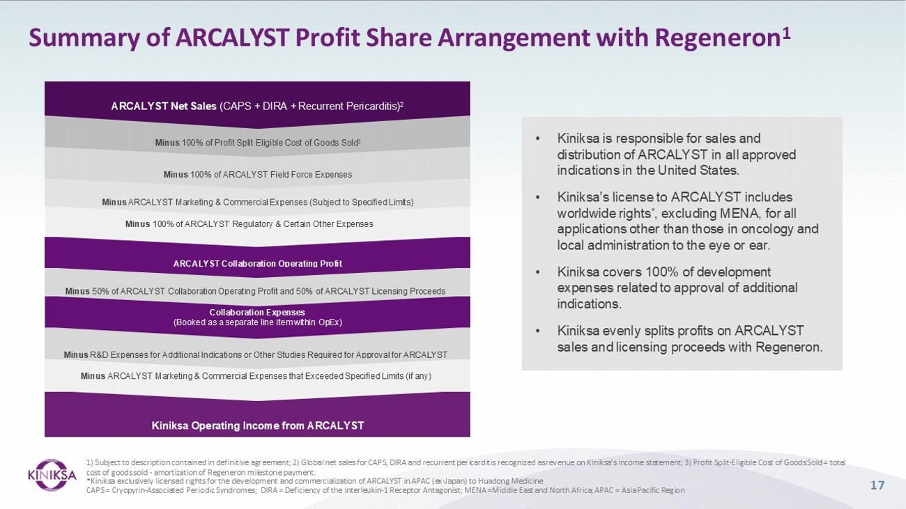 ARCALYST ® IL - 1α AND IL - 1β CYTOKINE TRAP DISEASE AREA: Recurrent pericarditis 1 ; painful and debilitating autoinflammatory cardiovascular disease COMPETITION 2 : First and only FDA - approved therapy for recurrent pericarditis REGULATORY: U.S. Orphan Drug exclusivity for treatment of and reduction in risk of recurrence of recurrent pericarditis; European Commission Orphan Drug designation in idiopathic pericarditis STATUS: FDA - Approved ECONOMICS: 50/50 split on profit and third - party proceeds RIGHTS: Kiniksa has worldwide rights 3 (excluding MENA) for all indications outside those in oncology and local administration to the eye or ear 5 1) ARCALYST is also approved and marketed for Cryopyrin - Associated Periodic Syndromes (CAPS) and maintenance of remission of Deficiency of Interleukin - 1 Receptor Antagonist (DIRA) in the United States; 2) Drugs@FDA: ARCALYST Prescribing Information, Ilaris Prescribing Information, Kineret Prescribing Information; Kaiser et al. Rheumatol Int (2012) 32:295 – 299; Theodoropoulou et al. Pediatric Rheumatology 2015, 13(Suppl 1):P155; Fleischmann et al, 2017 ACR/ARHP Abstract 1196; Kosloski et al, J of Clin Pharm 2016, 56 (12) 1582 - 1590; Cohen et al. Arthritis Research & Therapy 2011, 13:R125; Cardiel et al. Arthritis Research & Therapy 2010, 12:R192; Hong et al. Lancet Oncol 2014, 15: 656 - 666; 3) Kiniksa granted Huadong Medicine exclusive rights in the Asia Pacific Region, excluding Japan. IL - 1α = interleukin - 1α ; IL - 1β = interleukin - 1β; MENA = Middle East North Africa