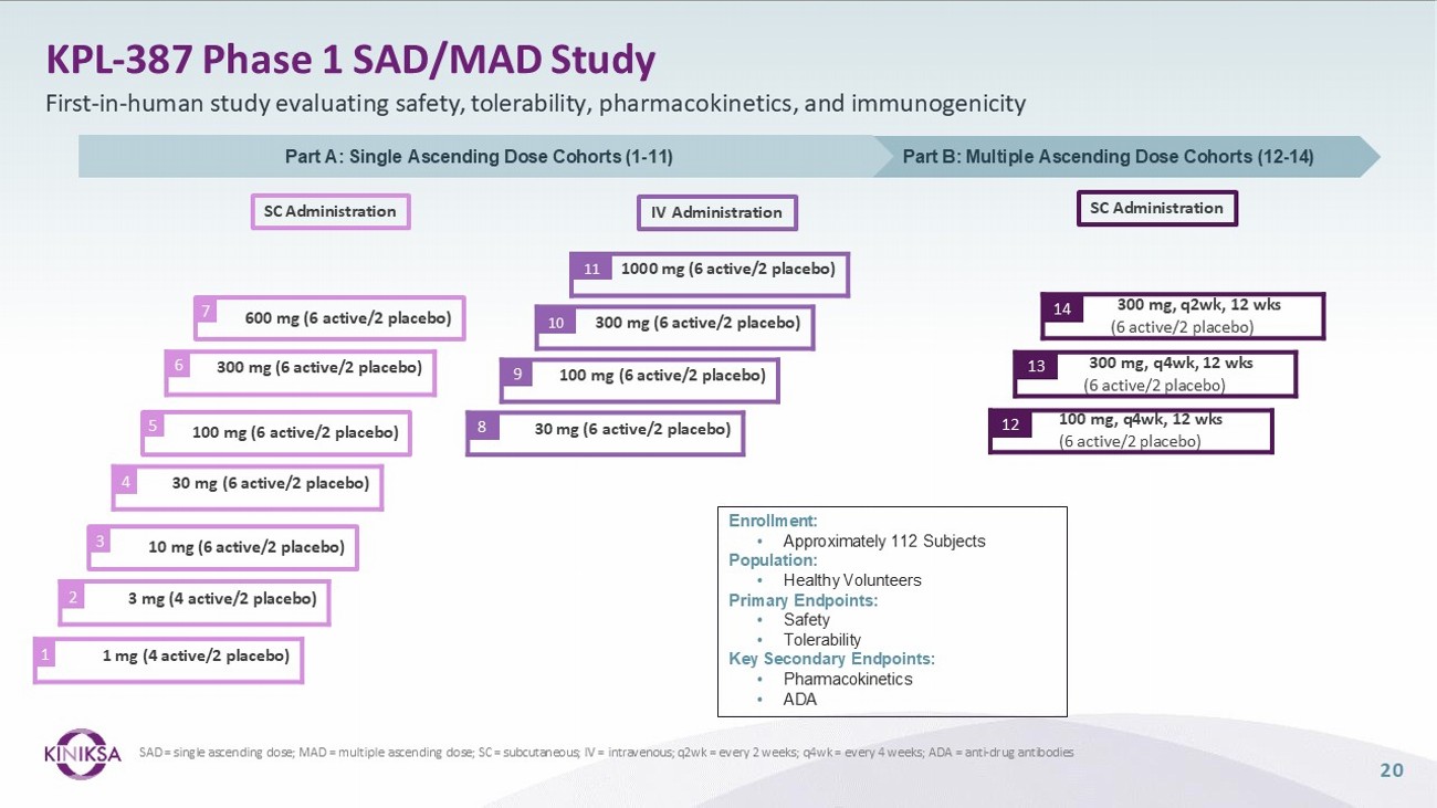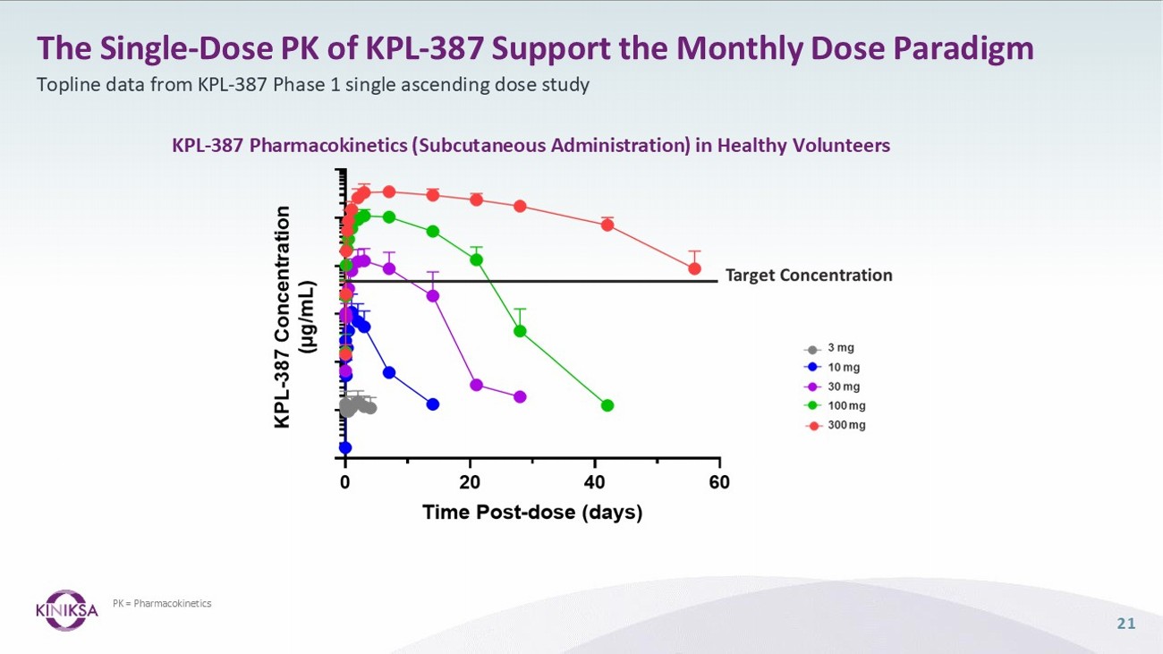 20 KPL - 387 Phase 1 SAD/MAD Study 3 mg (4 active/2 placebo) 2 30 mg (6 active/2 placebo) 4 100 mg (6 active/2 placebo) 5 300 mg (6 active/2 placebo) 6 600 mg (6 active/2 placebo) 7 10 mg (6 active/2 placebo) 3 1 mg (4 active/2 placebo) 1 SC Administration 300 mg (6 active/2 placebo) 10 1000 mg (6 active/2 placebo) 11 100 mg (6 active/2 placebo) 9 30 mg (6 active/2 placebo) 8 IV Administration 100 mg, q4wk, 12 wks 12 (6 active/2 placebo) 300 mg, q4wk, 12 wks 13 (6 active/2 placebo) 300 mg, q2wk, 12 wks 14 (6 active/2 placebo) SC Administration Enrollment: • Approximately 112 Subjects Population: • Healthy Volunteers Primary Endpoints: • Safety • Tolerability Key Secondary Endpoints: • Pharmacokinetics • ADA SAD = single ascending dose; MAD = multiple ascending dose; SC = subcutaneous; IV = intravenous; q2wk = every 2 weeks; q4wk = every 4 weeks; ADA = anti - drug antibodies First - in - human study evaluating safety, tolerability, pharmacokinetics, and immunogenicity Part A: Single Ascending Dose Cohorts (1 - 11) Part B: Multiple Ascending Dose Cohorts (12 - 14)