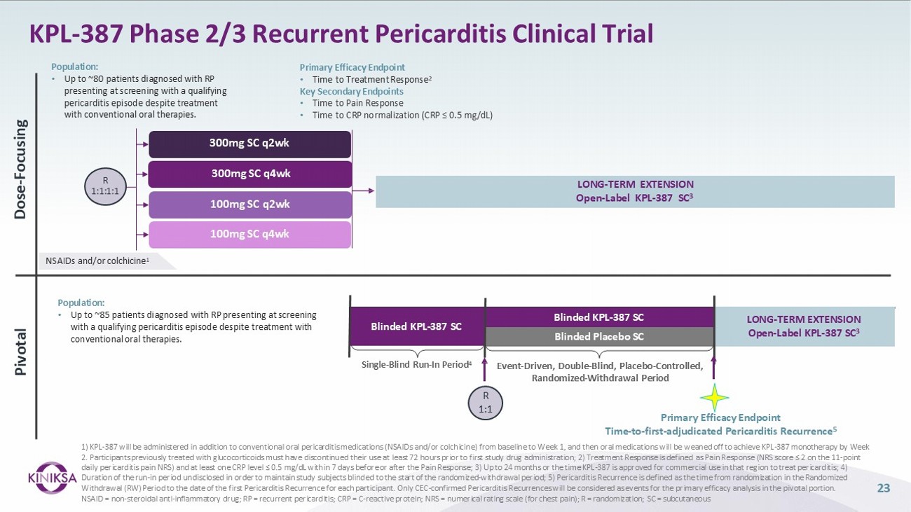 Kiniksa is on track to initiate a Phase 2/3 clinical trial designed to evaluate the efficacy and safety of KPL-387 administered subcutaneously (SC) in patients with recurrent pericarditis. The trial will consist of three overlapping parts combined into a single protocol: a dose-focusing portion (Phase 2), a pivotal portion (Phase 3), and long-term extensions (LTE).