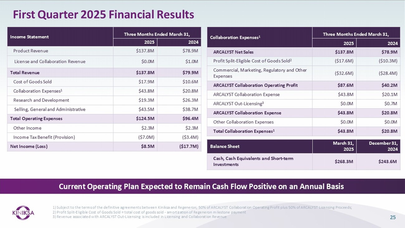 First Quarter 2025 Financial Results 25 Current Operating Plan Expected to Remain Cash Flow Positive on an Annual Basis 1) Subject to the terms of the definitive agreements between Kiniksa and Regeneron; 50% of ARCALYST Collaboration Operating Profit plus 50% of ARCALYST Licensing Proceeds; 2) Profit Split - Eligible Cost of Goods Sold = total cost of goods sold - amortization of Regeneron milestone payment 3) Revenue associated with ARCALYST Out - Licensing is included in Licensing and Collaboration Revenue Three Months Ended March 31, Income Statement 2024 2025 $78.9M $137.8M Product Revenue $1.0M $0.0M License and Collaboration Revenue $79.9M $137.8M Total Revenue $10.6M $17.9M Cost of Goods Sold $20.8M $43.8M Collaboration Expenses 1 $26.3M $19.3M Research and Development $38.7M $43.5M Selling, General and Administrative $96.4M $124.5M Total Operating Expenses $2.3M $2.3M Other Income ($3.4M) ($7.0M) Income Tax Benefit (Provision) ($17.7M) $8.5M Net Income (Loss) Three Months Ended March 31, Collaboration Expenses 1 2024 2025 $78.9M $137.8M ARCALYST Net Sales ($10.3M) ($17.6M) Profit Split - Eligible Cost of Goods Sold 2 ($28.4M) ($32.6M) Commercial, Marketing, Regulatory and Other Expenses $40.2M $87.6M ARCALYST Collaboration Operating Profit $20.1M $43.8M ARCALYST Collaboration Expense $0.7M $0.0M ARCALYST Out - Licensing 3 $20.8M $43.8M ARCALYST Collaboration Expense $0.0M $0.0M Other Collaboration Expenses $20.8M $43.8M Total Collaboration Expenses 1 December 31, 2024 March 31, 2025 Balance Sheet $243.6M $268.3M Cash, Cash Equivalents and Short - term Investments