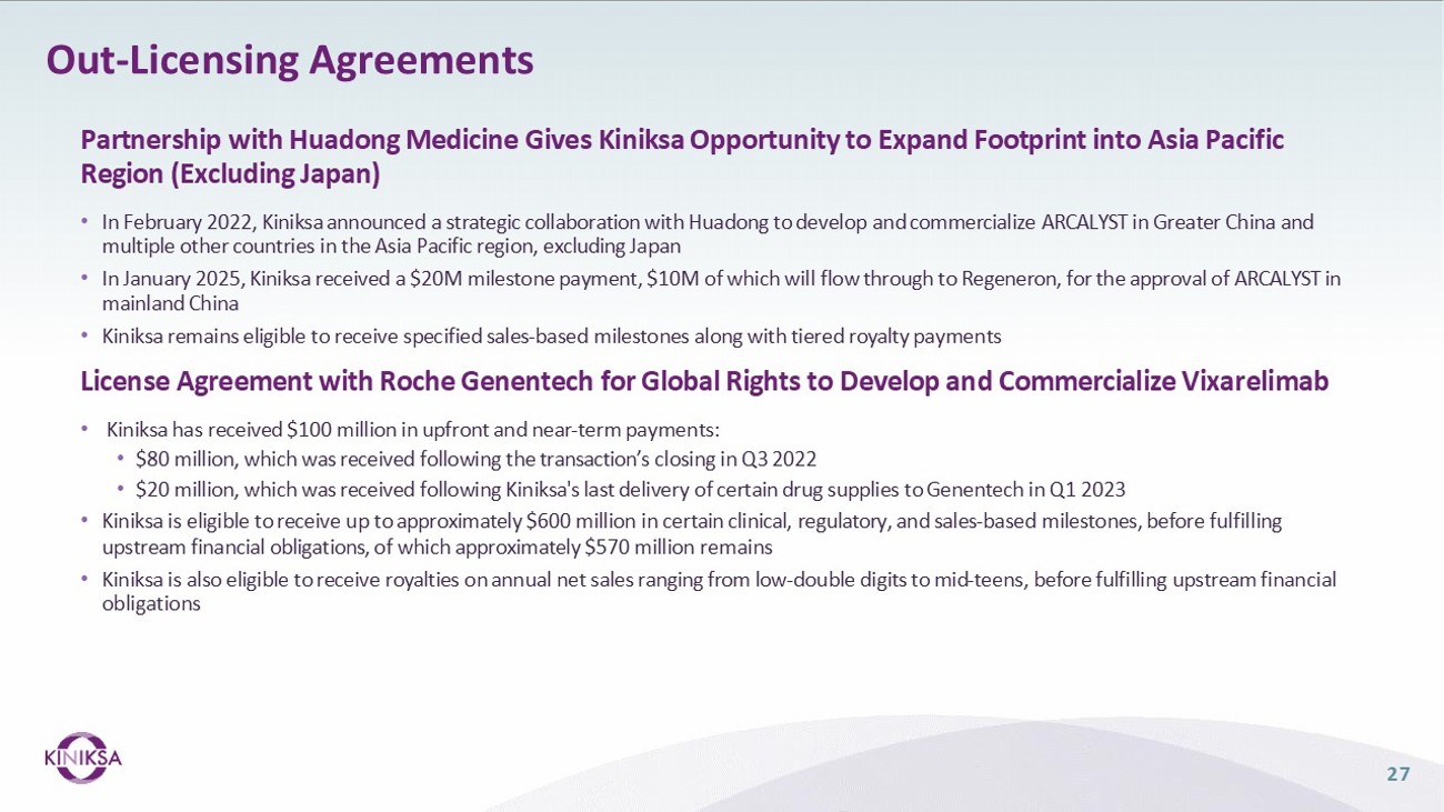 27 Partnership with Huadong Medicine Gives Kiniksa Opportunity to Expand Footprint into Asia Pacific Region (Excluding Japan) • In February 2022, Kiniksa announced a strategic collaboration with Huadong to develop and commercialize ARCALYST in Greater China and multiple other countries in the Asia Pacific region, excluding Japan • In January 2025, Kiniksa received a $20M milestone payment, $10M of which will flow through to Regeneron, for the approval of ARCALYST in mainland China • Kiniksa remains eligible to receive specified sales - based milestones along with tiered royalty payments License Agreement with Roche Genentech for Global Rights to Develop and Commercialize Vixarelimab • Kiniksa has received $100 million in upfront and near - term payments: • $80 million, which was received following the transaction’s closing in Q3 2022 • $20 million, which was received following Kiniksa's last delivery of certain drug supplies to Genentech in Q1 2023 • Kiniksa is eligible to receive up to approximately $600 million in certain clinical, regulatory, and sales - based milestones, before fulfilling upstream financial obligations, of which approximately $570 million remains • Kiniksa is also eligible to receive royalties on annual net sales ranging from low - double digits to mid - teens, before fulfilling upstream financial obligations Out - Licensing Agreements