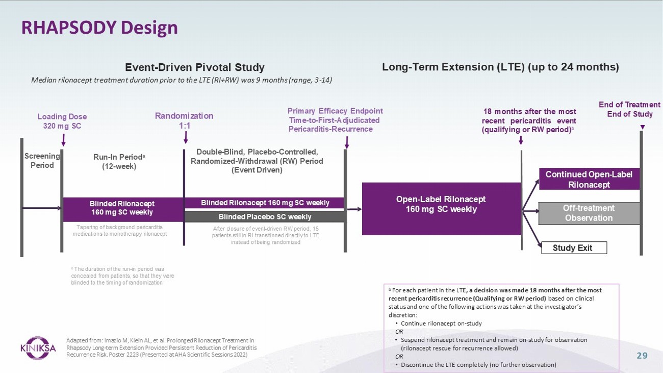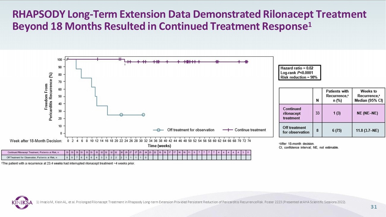 31 1) Imazio M, Klein AL, et al. Prolonged Rilonacept Treatment in Rhapsody Long - term Extension Provided Persistent Reduction of Pericarditis Recurrence Risk. Poster 2223 (Presented at AHA Scientific Sessions 2022). RHAPSODY Long - Term Extension Data Demonstrated Rilonacept Treatment Beyond 18 Months Resulted in Continued Treatment Response 1