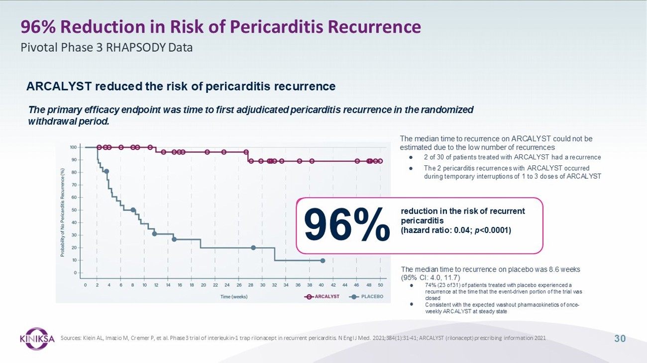 Screening Period Long - Term Extension (LTE) (up to 24 months) Loading Dose 320 mg SC Randomization 1:1 Primary Efficacy Endpoint Time - to - First - Adjudicated Pericarditis - Recurrence End of Treatment End of Study Open - Label Rilonacept 160 mg SC weekly a The duration of the run - in period was concealed from patients, so that they were blinded to the timing of randomization b For each patient in the LTE , a decision was made 18 months after the most recent pericarditis recurrence (Qualifying or RW period) based on clinical status and one of the following actions was taken at the investigator’s discretion: • Continue rilonacept on - study OR • Suspend rilonacept treatment and remain on - study for observation (rilonacept rescue for recurrence allowed) OR • Discontinue the LTE completely (no further observation) Continued Open - Label Rilonacept Off - treatment Observation Study Exit 18 months after the most recent pericarditis event (qualifying or RW period) b Event - Driven Pivotal Study Median rilonacept treatment duration prior to the LTE (RI+RW) was 9 months (range, 3 - 14) Double - Blind, Placebo - Controlled, Randomized - Withdrawal (RW) Period (Event Driven) Run - In Period a (12 - week) Blinded Rilonacept 160 mg SC weekly Blinded Rilonacept 160 mg SC weekly Blinded Placebo SC weekly After closure of event - driven RW period, 15 patients still in RI transitioned directly to LTE instead of being randomized Tapering of background pericarditis medications to monotherapy rilonacept 29 RHAPSODY Design Adapted from: Imazio M, Klein AL, et al. Prolonged Rilonacept Treatment in Rhapsody Long - term Extension Provided Persistent Reduction of Pericarditis Recurrence Risk. Poster 2223 (Presented at AHA Scientific Sessions 2022)