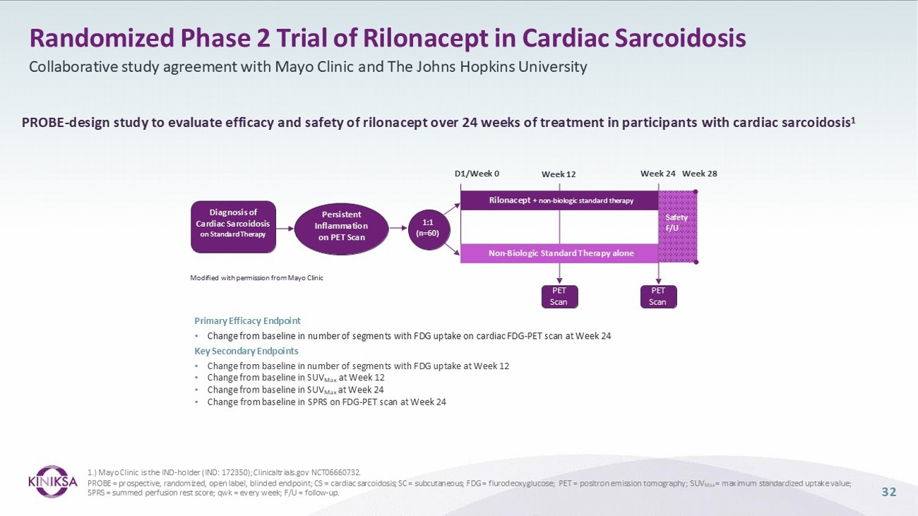 32 Randomized Phase 2 Trial of Rilonacept in Cardiac Sarcoidosis Collaborative study agreement with Mayo Clinic and The Johns Hopkins University Primary Efficacy Endpoint • Change from baseline in number of segments with FDG uptake on cardiac FDG - PET scan at Week 24 Key Secondary Endpoints • Change from baseline in number of segments with FDG uptake at Week 12 • Change from baseline in SUV Max at Week 12 • Change from baseline in SUV Max at Week 24 • Change from baseline in SPRS on FDG - PET scan at Week 24 PROBE - design study to evaluate efficacy and safety of rilonacept over 24 weeks of treatment in participants with cardiac sarcoidosis 1 Diagnosis of Cardiac Sarcoidosis on Standard Therapy Persistent Inflammation on PET Scan 1:1 (n=60) Non - Biologic Standard Therapy alone PET Scan PET Scan Safety F/U D1/Week 0 Week 12 Rilonacept + non - biologic standard therapy Week 24 Week 28 1.) Mayo Clinic is the IND - holder (IND: 172350); Clinicaltrials.gov NCT06660732. PROBE = prospective, randomized, open label, blinded endpoint; CS = cardiac sarcoidosis; SC = subcutaneous; FDG = flurodeoxyglucose; PET = positron emission tomography; SUV Max = maximum standardized uptake value; SPRS = summed perfusion rest score; qwk = every week; F/U = follow - up. Modified with permission from Mayo Clinic
