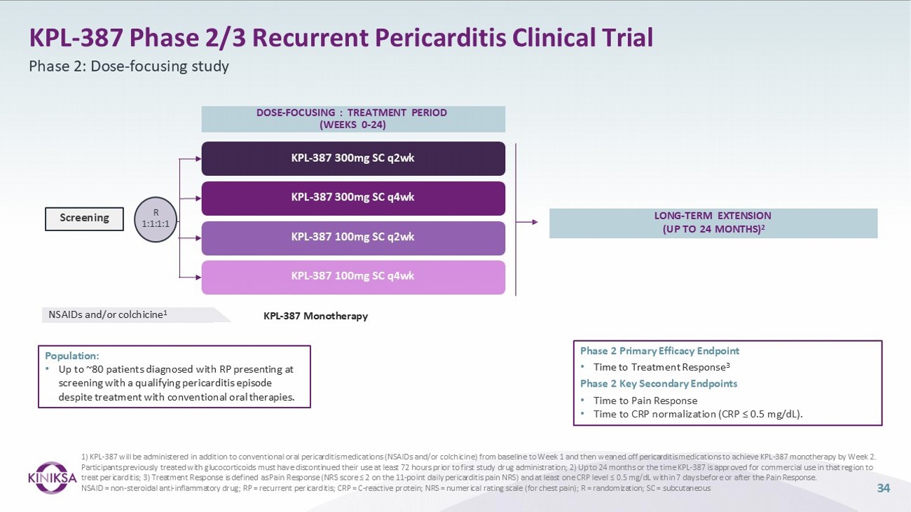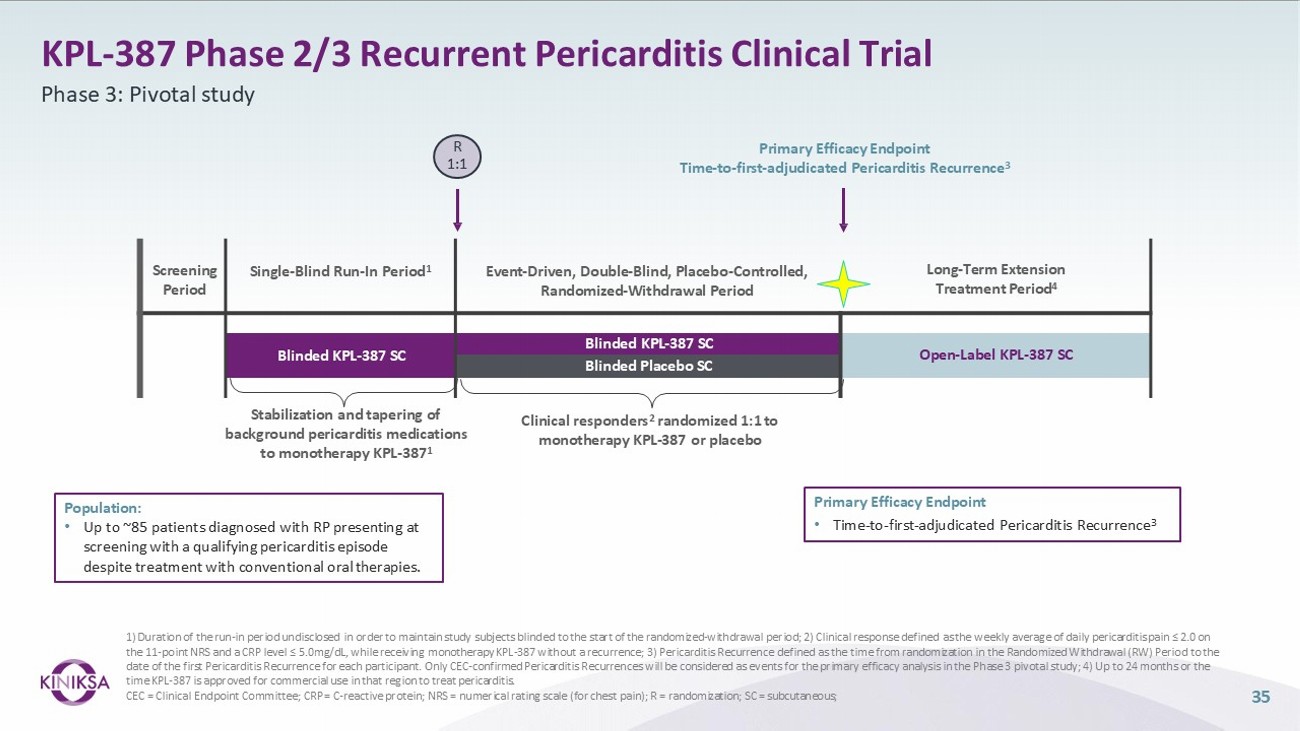 KPL - 387 Phase 2/3 Recurrent Pericarditis Clinical Trial Phase 2: Dose - focusing study 1) KPL - 387 will be administered in addition to conventional oral pericarditis medications (NSAIDs and/or colchicine) from baseline to Week 1 and then weaned off pericarditis medications to achieve KPL - 387 monotherapy by Week 2. Participants previously treated with glucocorticoids must have discontinued their use at least 72 hours prior to first study drug administration; 2) Up to 24 months or the time KPL - 387 is approved for commercial use in that region to treat pericarditis; 3) Treatment Response is defined as Pain Response (NRS score ≤ 2 on the 11 - point daily pericarditis pain NRS) and at least one CRP level ≤ 0.5 mg/dL within 7 days before or after the Pain Response. NSAID = non - steroidal anti - inflammatory drug; RP = recurrent pericarditis; CRP = C - reactive protein; NRS = numerical rating scale (for chest pain); R = randomization; SC = subcutaneous KPL - 387 300mg SC q2wk KPL - 387 300mg SC q4wk KPL - 387 100mg SC q2wk KPL - 387 100mg SC q4wk KPL - 387 Monotherapy NSAIDs and/or colchicine 1 DOSE - FOCUSING : TREATMENT PERIOD (WEEKS 0 - 24) LONG - TERM EXTENSION (UP TO 24 MONTHS) 2 R 1:1:1:1 Screening Phase 2 Primary Efficacy Endpoint • Time to Treatment Response 3 Phase 2 Key Secondary Endpoints • Time to Pain Response • Time to CRP normalization (CRP ≤ 0.5 mg/dL). Population: • Up to ~80 patients diagnosed with RP presenting at screening with a qualifying pericarditis episode despite treatment with conventional oral therapies. 34